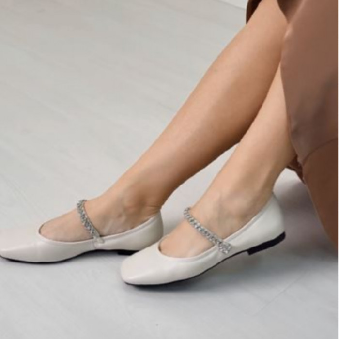 Балетки 9016 из натуральной кожи молочного цвета. Эти балетки с широким устойчивым каблуком, закругленным носком и ремешком, украшенным стразами, сочетают стиль и комфорт.