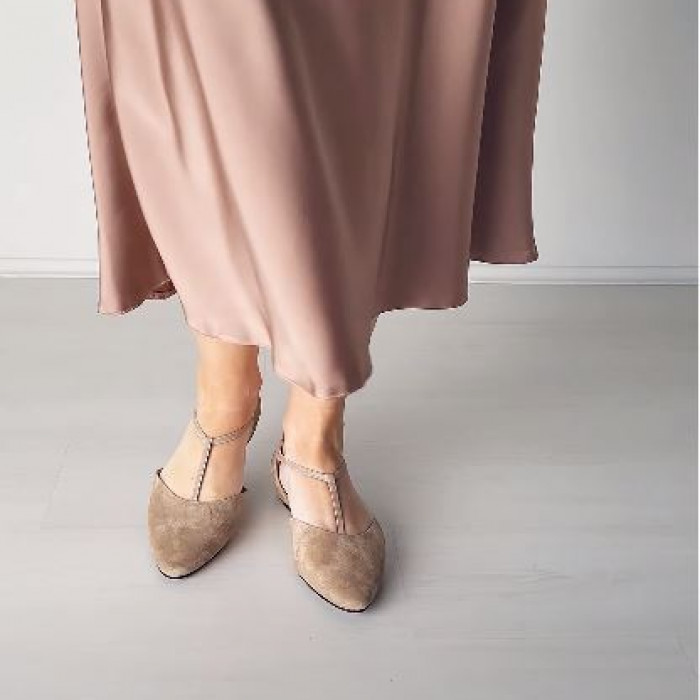 Балетки 9145, выполненные из натуральной замши в бежевом цвете, - идеальный выбор для стильных женщин, ценящих комфорт и элегантность. Основными особенностями этих балеток являются острый мыс и эластичные ремешки на подъеме, которые обеспечивают идеальную посадку и комфорт при носке.