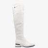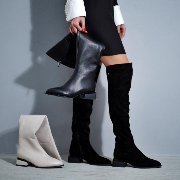 Ботфорты 9899 молочного цвета изготовлены из натуральной кожи, что обеспечивает их долговечность и элегантный внешний вид. Широкий каблук и острый мыс не только добавляют изящества, но и обеспечивают комфорт при длительной носке. Молния с внутренней стороны облегчает процесс обувания, а металлический декор на каблуке придает ботфортам уникальный стиль.
