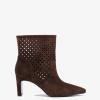Ботильоны 10237 выполнены из натуральной замши коричневого цвета, что придает им изысканный и современный вид. Устойчивый прямоугольный каблук (каблук обтянут натуральной замшей) и острый мыс обеспечивают не только элегантный внешний вид, но и комфорт при носке. Модель с эффектной перфорацией, добавляющей стильный акцент. Обувь не имеет молнии, что делает ее более лаконичной и минималистичной.