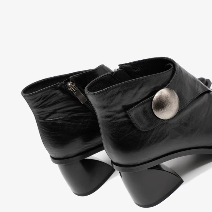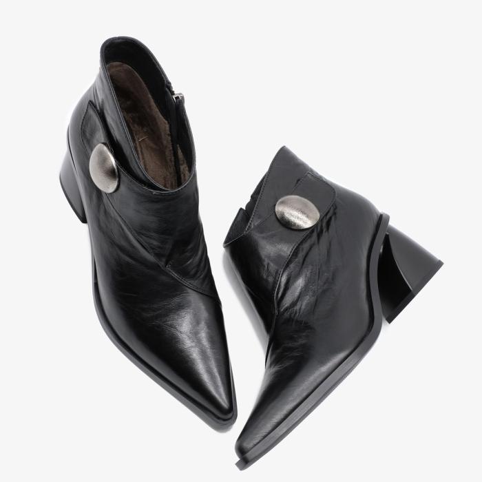 Ботильоны 10786 черного цвета изготовлены из натуральной кожи. Устойчивый каблук и острый мыс обеспечивают элегантный внешний вид. Молния с внутренней стороны и ремешок с липучкой делают обувь удобной в использовании и позволяют легко регулировать посадку. Металлический декор добавляет изысканности и уникальности паре.