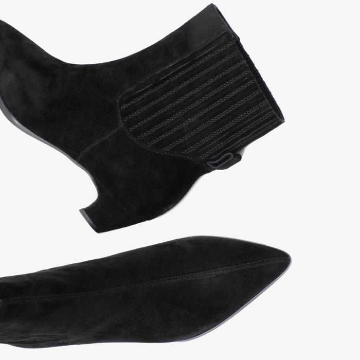 Ботильоны 10787 черного цвета изготовлены из натуральной замши, что придает им элегантный и роскошный вид. Устойчивый каблук (каблук обтянут натуральной замшей) и острый мыс обеспечивают элегантный внешний вид. Эластичные вставки по бокам обеспечивают легкость в обувании и удобную посадку.