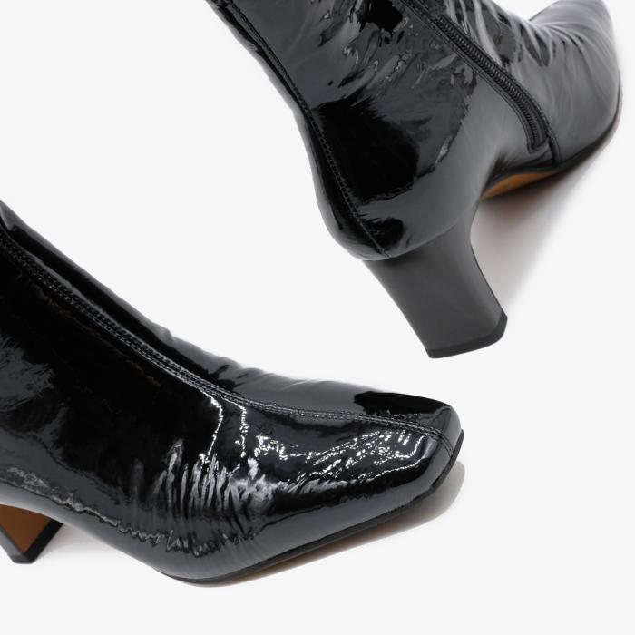 Черные ботильоны 10845 из натуральной лакированной кожи — это стильная и элегантная обувь, которая станет идеальным дополнением к Вашему гардеробу. Эти ботильоны оснащены устойчивым прямоугольным каблуком и квадратным мысом, что обеспечивает комфорт и стабильность при ходьбе. Молния с внутренней стороны облегчает процесс обувания, а фактура "мятой кожи" придает им уникальный и модный вид.