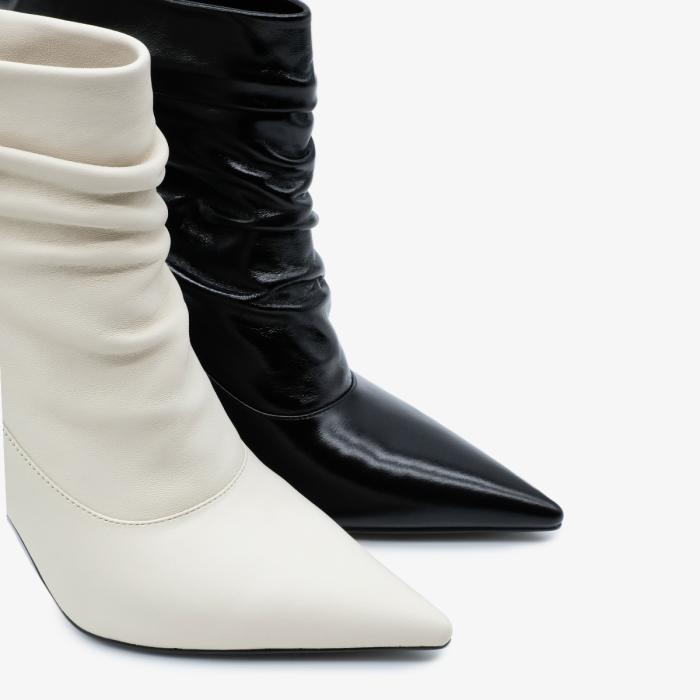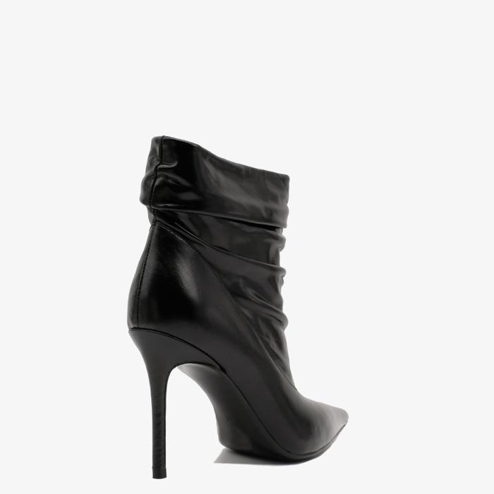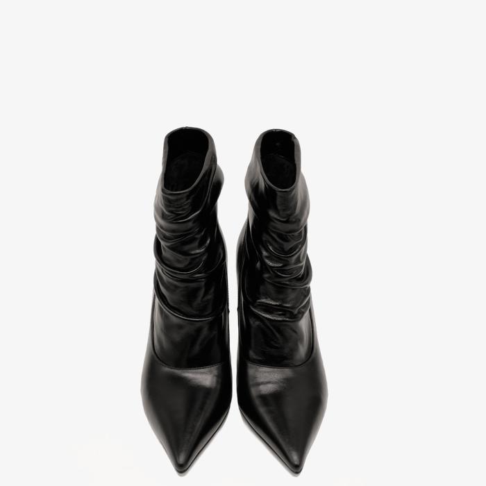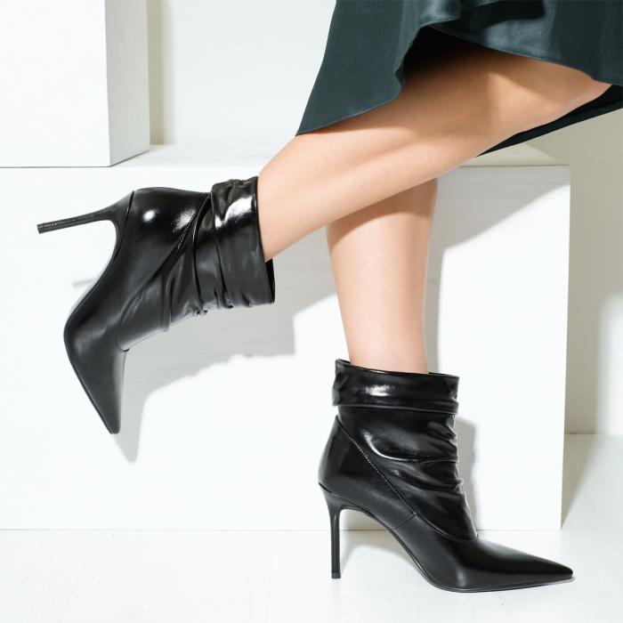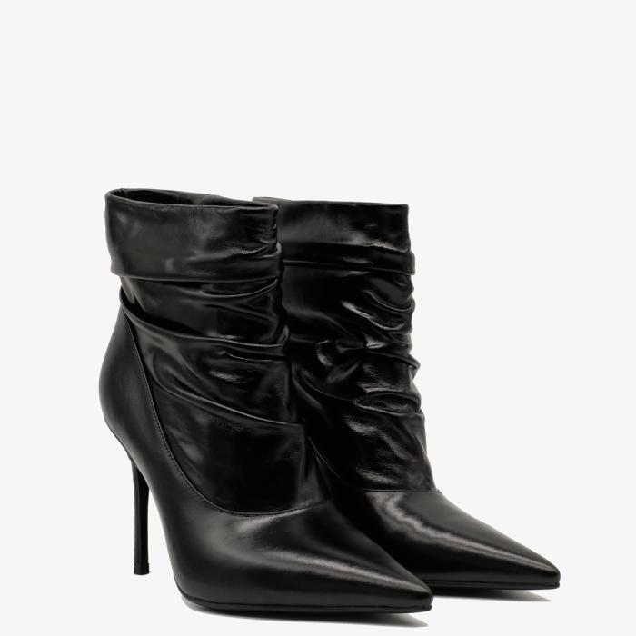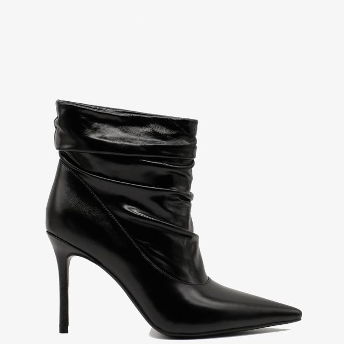 Ботильоны 9665 черного цвета, выполненные из натуральной кожи, станут отличным дополнением к Вашему гардеробу. Устойчивый каблук-шпилька (каблук обтянут натуральной кожей) и острый мыс придают обуви элегантный вид, а отсутствие молнии и сборка на подъеме делают их удобными и стильными.