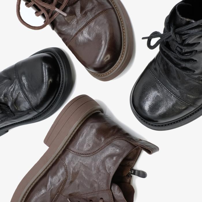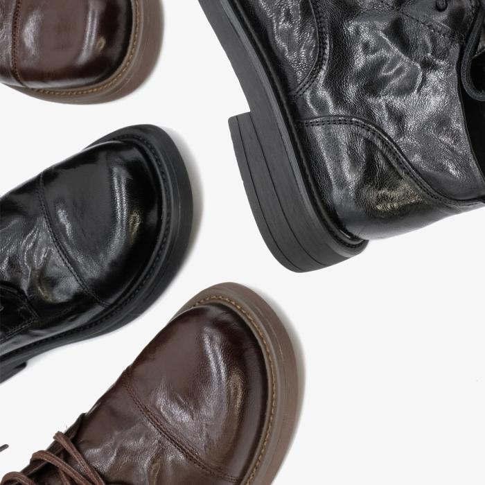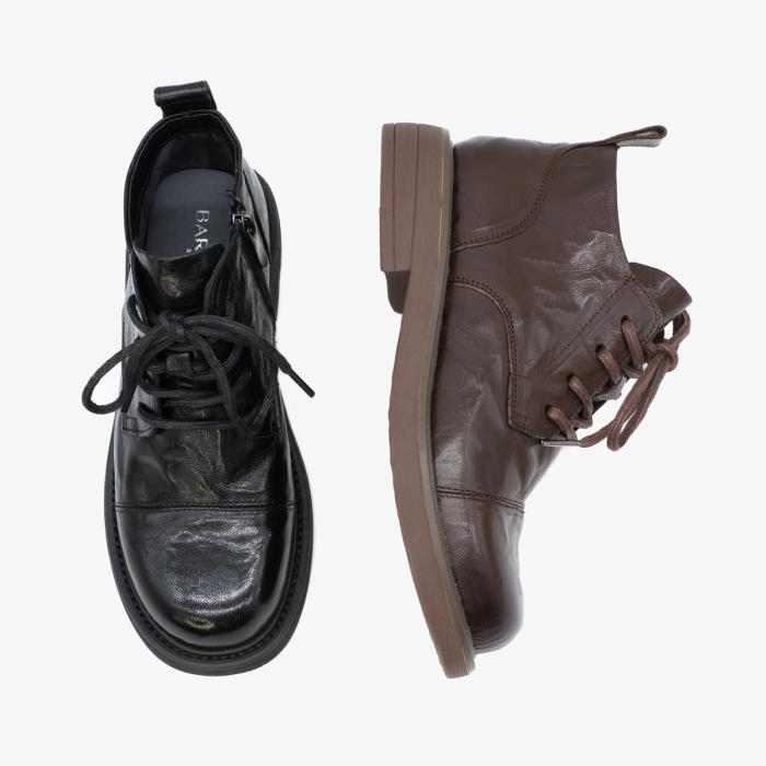 Черные ботинки 10075, выполненные из натуральной кожи, станут идеальным дополнением к Вашему гардеробу. Широкий устойчивый каблук и закругленный мыс обеспечивают комфорт при длительной носке, а молния с внутренней стороны и шнуровка на подъеме позволяют легко регулировать посадку и быстро надевать обувь. Эффект мятой кожи придает ботинкам стильный и современный вид, делая их универсальными для различных образов.