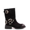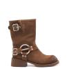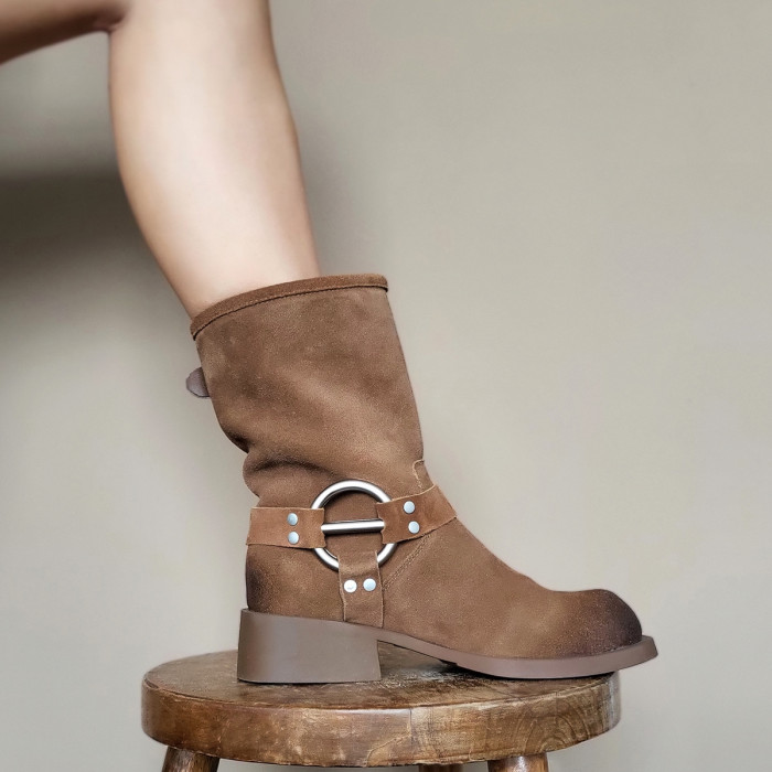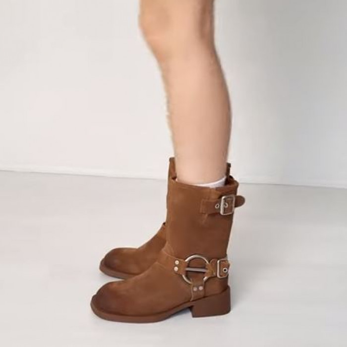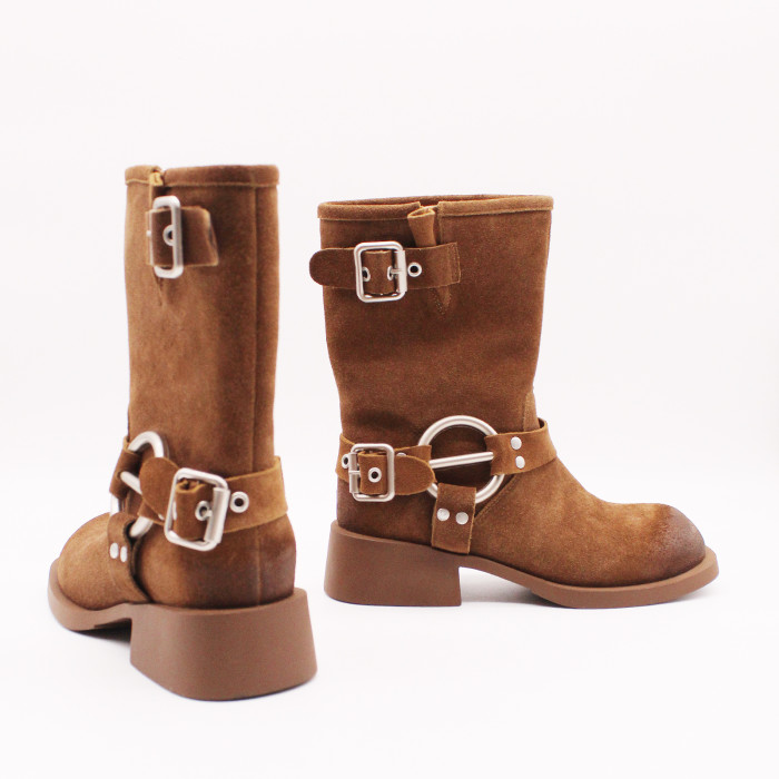 Cтильные полусапоги 8975 из натуральной замши коричневого цвета. Эти полусапоги имеют широкий устойчивый каблук и закругленный носок, что обеспечивает комфорт и элегантность. Они украшены металлическим декором в виде ремешков и пряжек, придающим изделию нотку изысканности. Эффект потертой кожи на носке и пятке придает этим ботинкам модный элемент. Без молнии они выглядят гладкими и обтекаемыми.