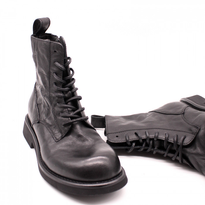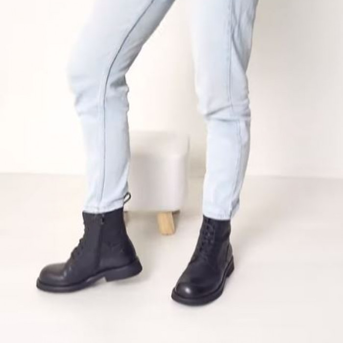 Ботинки 8981 изготовлены из натуральной кожи в черном цвете. Эти элегантные ботинки отличаются закругленным мысом, застёжкой на молнию с внутренней стороны, широким устойчивым каблуком, шнуровкой и с эффектом мятой кожи, что придает им стильный и модный вид.