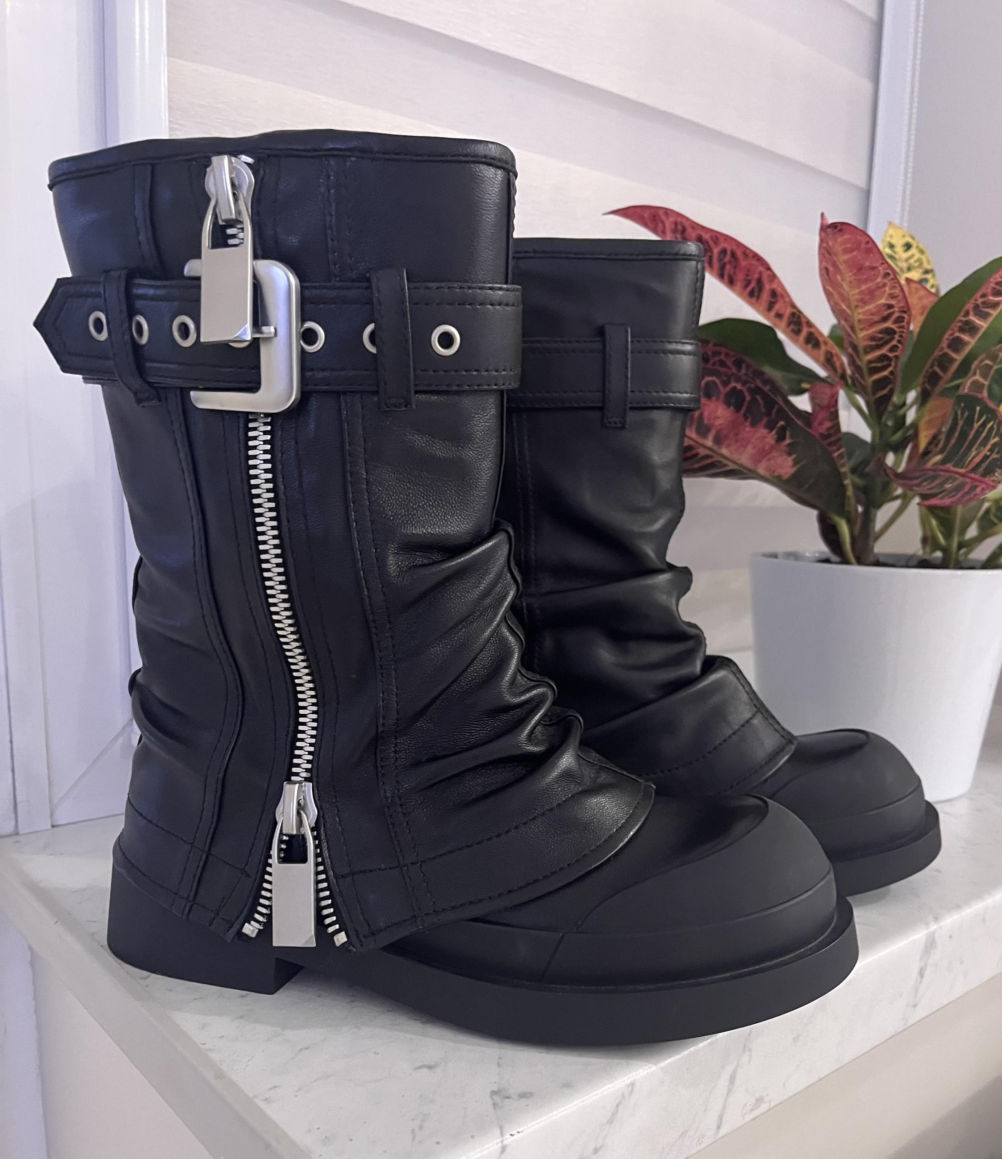 Ботинки 9812 черного цвета изготовлены из натуральной кожи, что гарантирует их долговечность и привлекательный внешний вид. Широкий каблук и закругленный мыс обеспечивают комфорт и стабильность при ходьбе, а отсутствие молнии делает обувь более универсальной и легкой в использовании. Декор в виде молнии и широкого ремня с пряжкой добавляет оригинальности и делает ботинки более привлекательными.