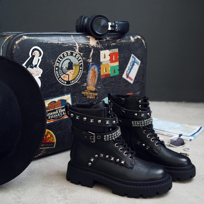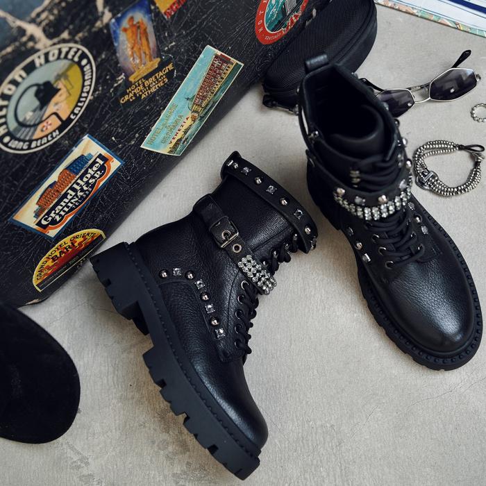 Ботинки 9866 черного цвета изготовлены из натуральной кожи, что обеспечивает им долговечность и элегантный внешний вид. Широкий каблук и закругленный мыс обеспечивают надежную поддержку и комфорт при ношении. Молния с внутренней стороны и шнуровка на подъеме делают процесс надевания быстрым и удобным, а металлический декор и стразы добавляют изюминку в Ваш образ. В комплект входят два съемных ремешка на кнопках (один с пряжкой), оформленные металлическим декором и стразами.