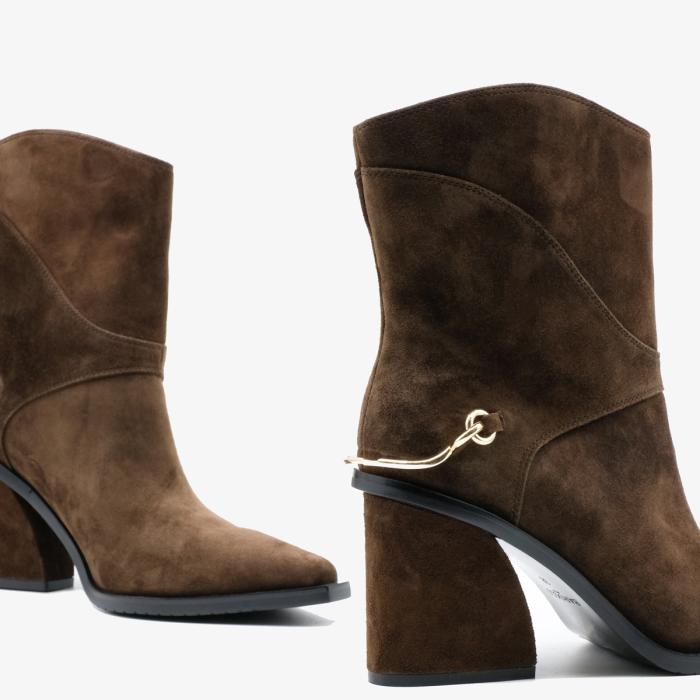 Казаки 10149 коричневого цвета изготовлены из натуральной замши, что придаёт им стильный и современный вид. Устойчивый каблук (каблук обтянут натуральной замшей) и острый мыс обеспечивают не только элегантный силуэт, но и комфорт при носке. Отсутствие молнии делает обувь легкой в использовании, а металлический декор в пяточной части добавляет изюминку.