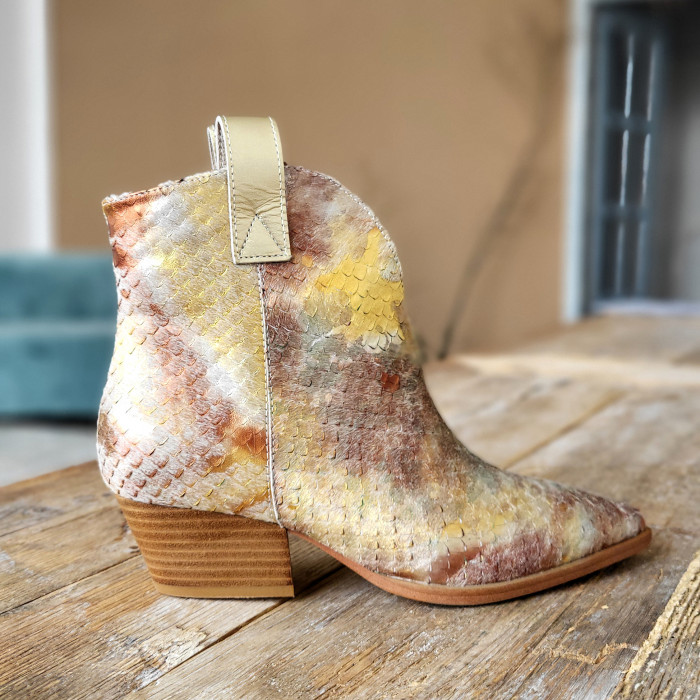 Казаки 9032 из натуральной кожи с фактурой "под рептилию" - стильная модель для яркого образа. Ключевые особенности этих казаков заключается в устойчивом каблуке, остром мысе и отсутствии молнии.