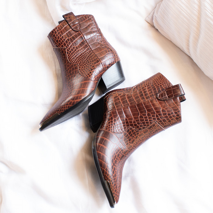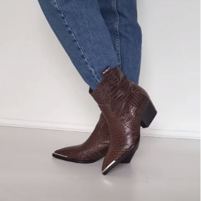 Казаки 9063 коричневого цвета, выполненные из натуральной кожи. Эти ботинки с устойчивым каблуком, заостренными носками, металлическим декором на носке и стильным принтом под рептилию сочетают в себе долговечность и стильный вид.