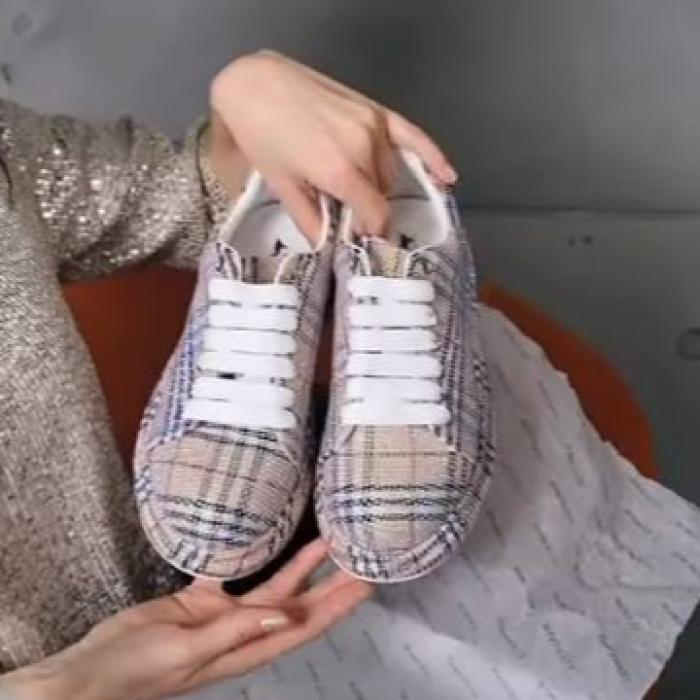 Кеды 8837 изготовлены из высококачественного текстиля и представлены в бежевом цвете с клетчатым принтом. Они отличаются своей ключевой особенностью - оформлением стразами и шнуровкой. Эта уникальная деталь придает им стильный и модный вид.