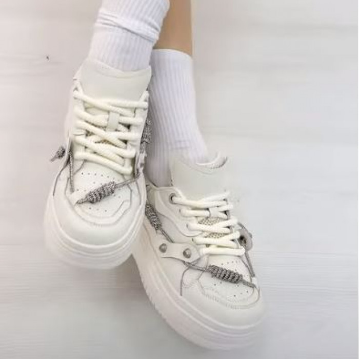 Кеды 9014 изготовлены из натуральной кожи молочного цвета, что придает им роскошный и стильный вид. Ключевой особенностью этих кед является удобная система шнуровки, обеспечивающая надежную и комфортную посадку. Кроме того, они оснащены съемной декоративной цепочкой, украшенной сверкающими стразами, которые придадут Вашему образу нотку гламура.
