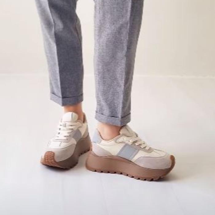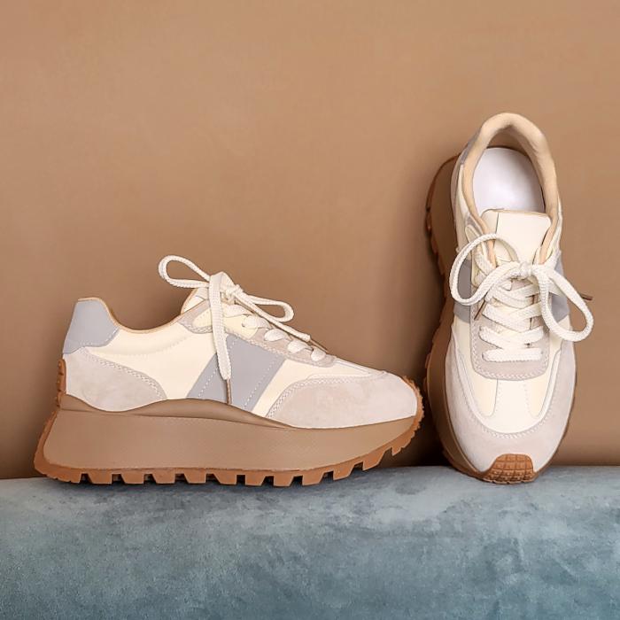 Кроссовки 9110, выполненные из натуральной замши бежевого цвета в сочетании с текстилем в молочном цвете и с кожанными вставками контрастного серого цвета, - стильный и удобный выбор обуви. Ключевая особенность этих кроссовок - комфортная платформа, закругленный мыс и шнуровка на подъеме, обеспечивающие идеальную посадку и удобство при носке.