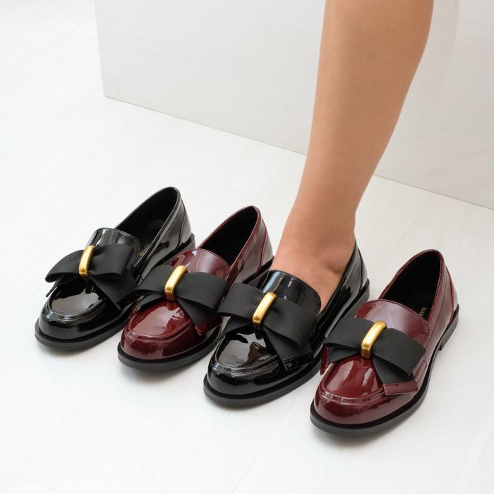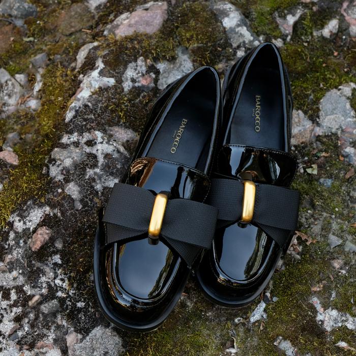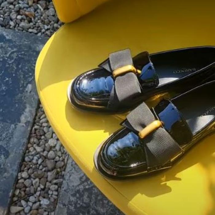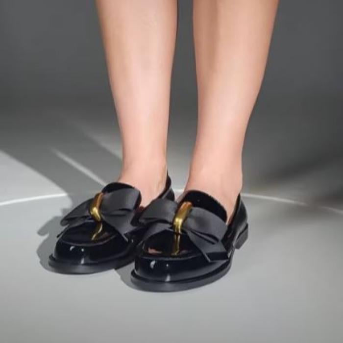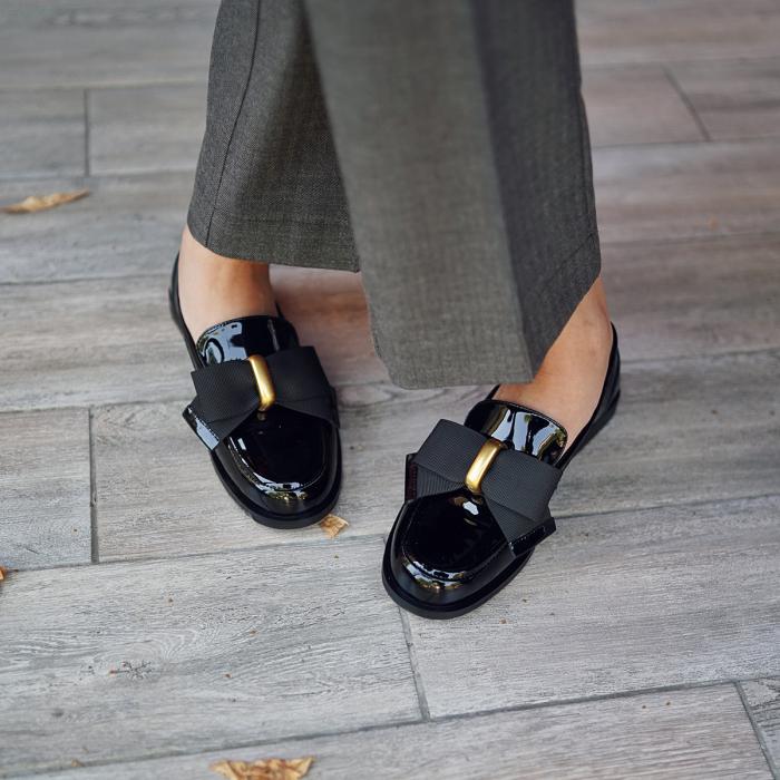Лоферы 9631 выполнены из натуральной лакированной кожи черного цвета, что придает им элегантный и современный вид. Ключевая особенность этих лоферов — широкий каблук и закругленный мыс, дополненные изысканным декором в виде банта на подъеме. Это сочетание не только обеспечивает комфорт при носке, но и добавляет нотку утонченности в Ваш образ.