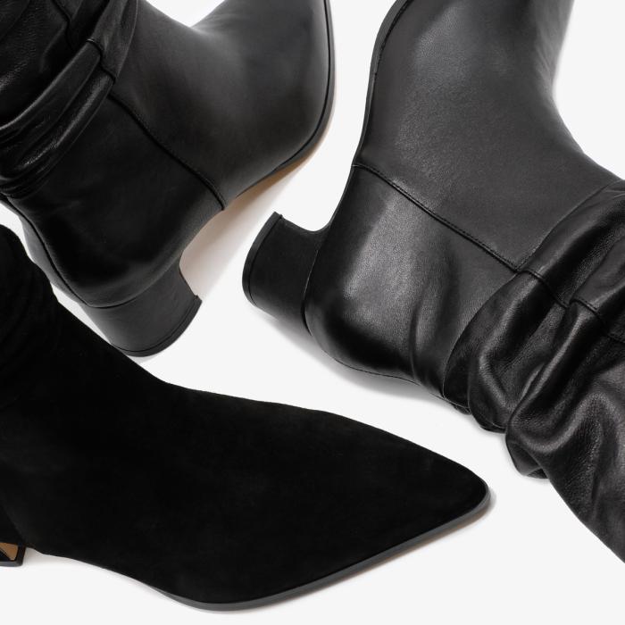 Черные сапоги 10793 из натуральной замши станут отличным дополнением Вашего гардероба. Сапоги оснащены устойчивым каблуком (каблук обтянут натуральной замшей) и острым мысом, что обеспечивает не только элегантный внешний вид, но и комфорт при длительной носке. Акцентная сборка на голенище добавляет изюминку и делает обувь более выразительной.