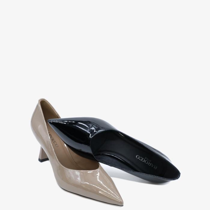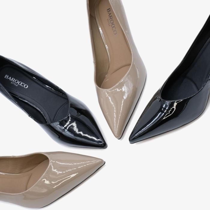 Туфли 10082 выполнены из натуральной лакированной кожи серо-бежевого цвета, идеально подходящие для создания элегантного образа. Устойчивый каблук и острый мыс придают туфлям-лодочкам изысканный вид, обеспечивая комфорт и стабильность при ходьбе.