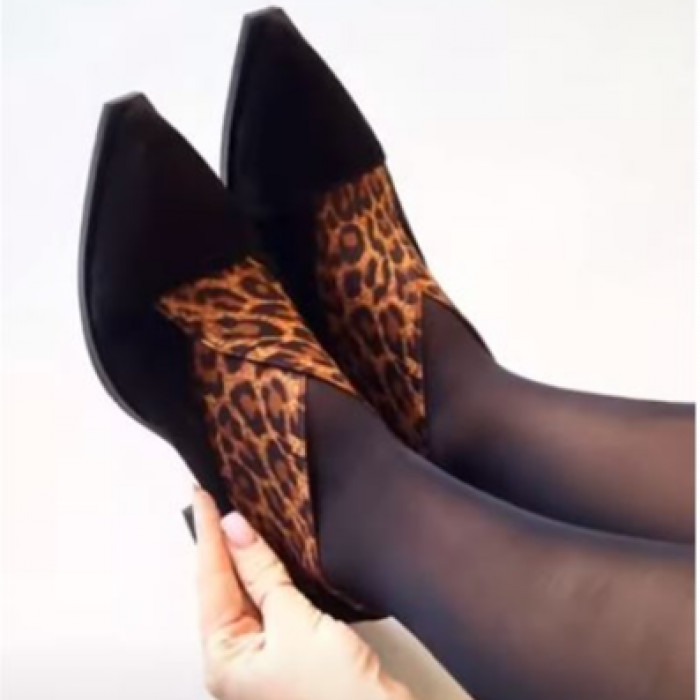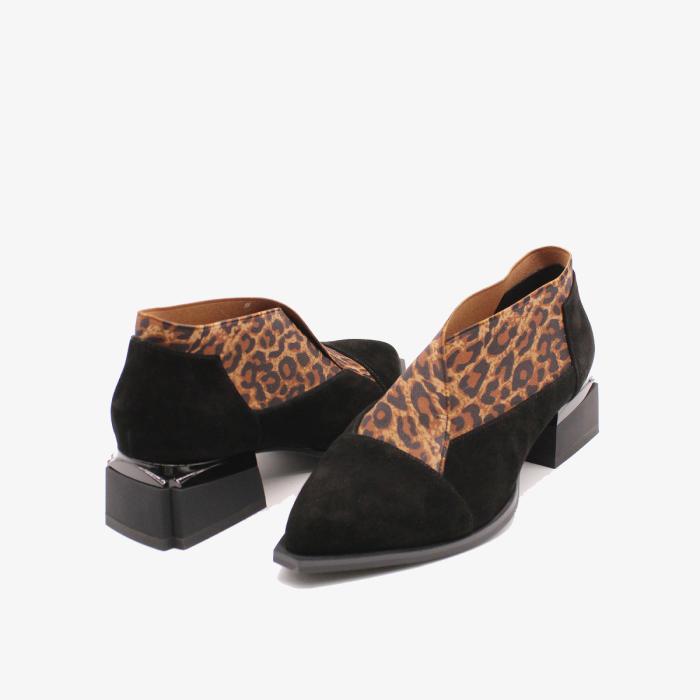 Ключевая особенность полуботинок - заострённый мыс и эластичные вставки с леопардовым принтом, которые обеспечивают комфортную посадку на ноге. Высота каблука 4,5 см и подошва из непористой резины обеспечивают долговечность. Стелька и внутренний материал из натуральной кожи создают ощущение роскоши, а материал верха из натуральной замши и текстиля создает уникальный вид.