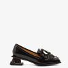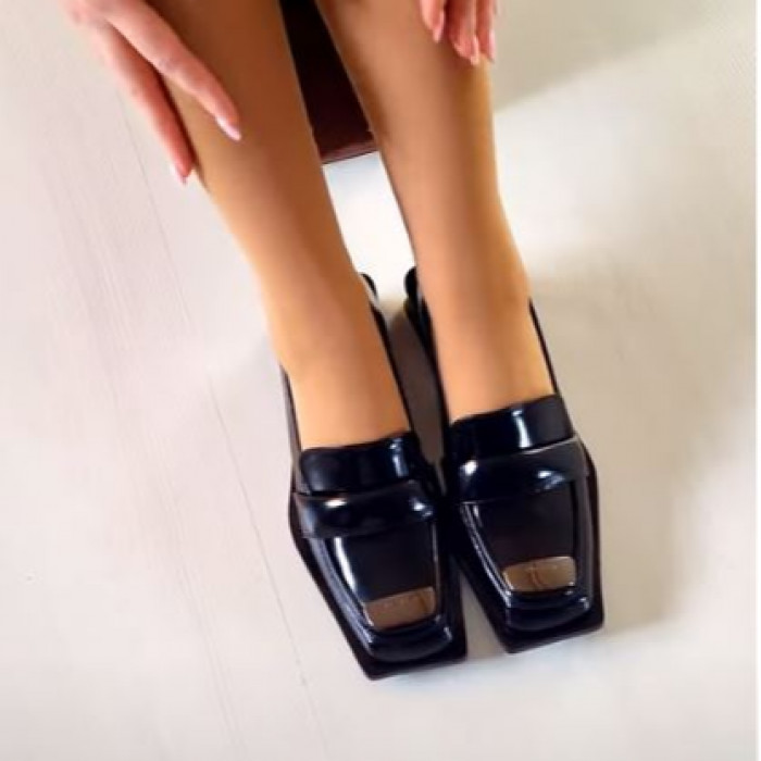Туфли 8950 выполнены из натуральной кожи черного цвета. Эти туфли с устойчивым каблуком и квадратным носком сочетают в себе стиль и комфорт. Металлические украшения на носке и металлический каблук придают нотку изысканности.