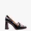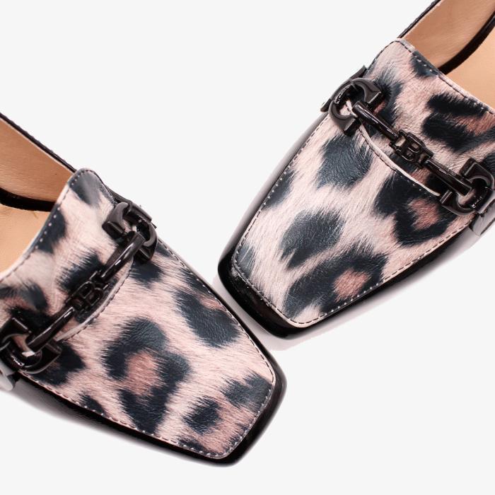Туфли 8992 выполнены из натуральной лакированной кожи черного цвета. Туфли имеют широкий устойчивый каблук, квадратный носок и переднюю часть из кожи с анималистическим принтом, подчеркнутую металлическим декором на подъеме, что придает обуви элегантность и уникальность