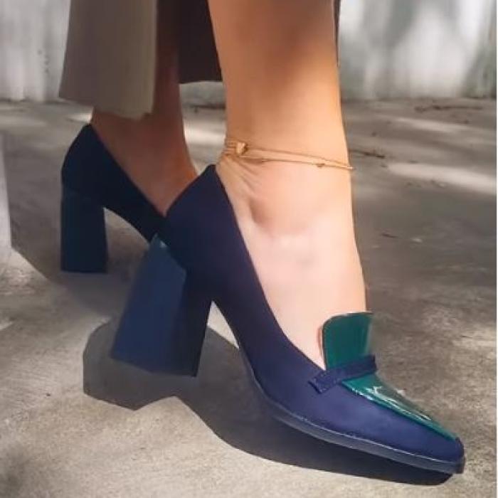 Туфли 9083 выполнены из натуральной замши синего цвета со вставкой из натуральной лакированной кожи зеленого цвета. Эти туфли имеют устойчивый каблук и шикарный квадратный носок, что обеспечивает стиль и комфорт.