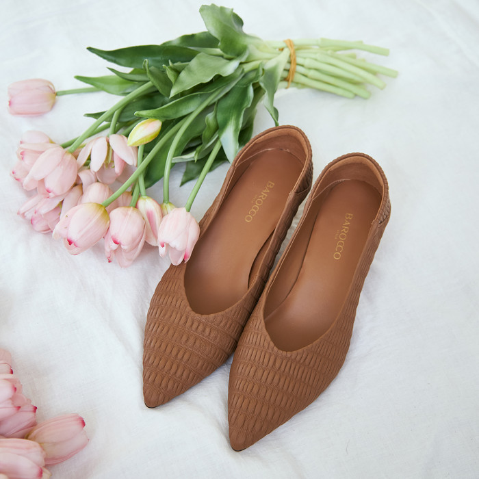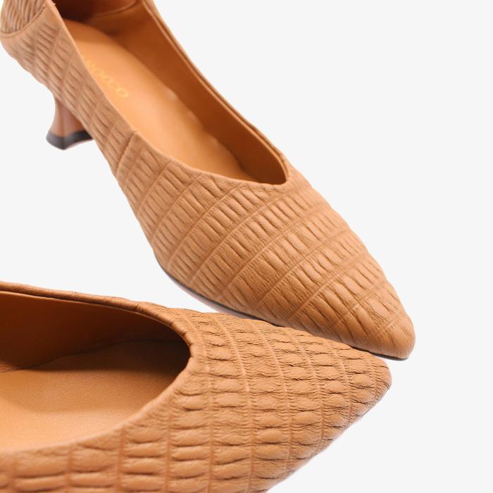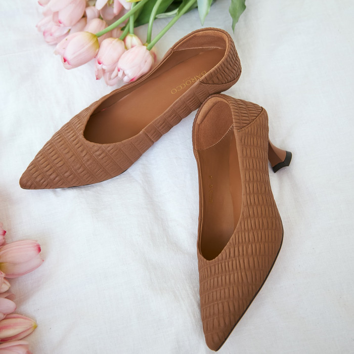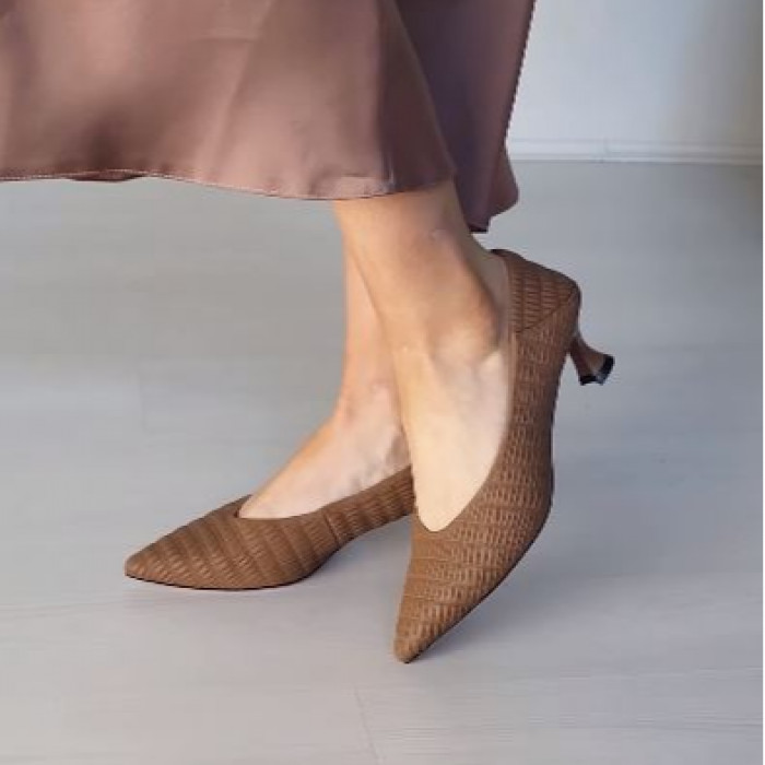 Туфли 9204 на каблуке из натуральной кожи в бежевом цвете – элегантный выбор для стильных женщин. Основное преимущество данных туфель – устойчивый каблук и острый мыс, что придает обуви изысканный вид. Дополнительно, обувь оформлена тиснением под плетение, что придает им уникальный и модный вид.