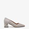 Туфли 9349, выполненные из натуральной кожи в серебряном цвете, станут стильным дополнением к вашему образу. Туфли отличаются широким устойчивым каблуком (каблук обтянут натуральной кожей), острым мысом, металлическим декором на каблуке и изысканной перфорацией, что придает им уникальный вид и обеспечивает удобство при ношении.