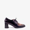 Туфли 9544, выполненные из натуральной кожи черного цвета, - идеальный выбор для стильных образов. Эти туфли отличаются широким устойчивым каблуком, острым мысом, шнуровкой на подъеме, принтом "рептилия", а также вставкой из натуральной замши анималистичного принта (леопард) в носочной части. Этот дизайн придает обуви утонченный вид, делая ее стильным акцентом Вашего образа.