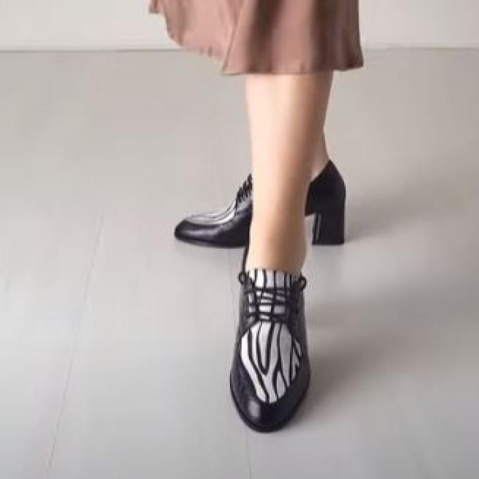 Туфли 9545, выполненные из натуральной кожи черного цвета, - идеальный выбор для стильных образов. Эти туфли отличаются широким устойчивым каблуком, острым мысом, шнуровкой на подъеме, принтом "рептилия", а также вставкой из нубука анималистичного принта (зебра) в носочной части. Этот дизайн придает обуви утонченный вид, делая ее стильным акцентом Вашего образа.