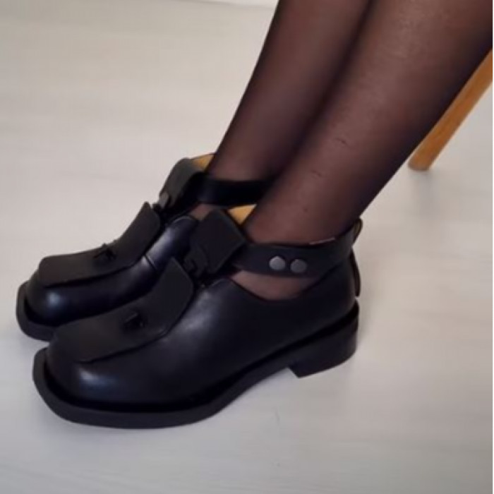 Их ключевая особенность - квадратный мыс, широкий ремешок на кнопках, устойчивый каблук, что обеспечивает комфорт и стабильность при ходьбе. Оригинальный металлический декор позволяет носить модель в разных вариациях.
