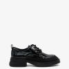 Туфли 9576 выполнены из натуральной лакированной кожи в черном цвете. Их ключевая особенность заключается в широком устойчивом каблуке, закругленном мысе, металлическом декоре и стильной шнуровке на подъеме, что обеспечивает не только модный внешний вид, но и комфорт при ношении.
