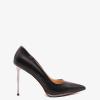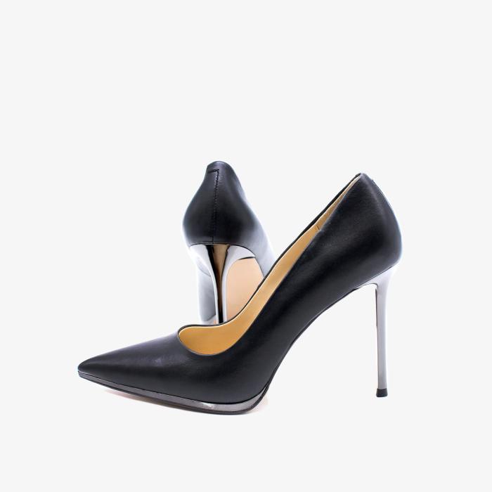 Элегантные туфли 8961 на шпильке из натуральной кожи в классическом черном цвете. Особенностью этих туфель является металлический каблук-шпилька, острый мыс и металлическая накладка на подошве, что придает образу изысканности и утонченности, а также привлекает внимание окружающих.